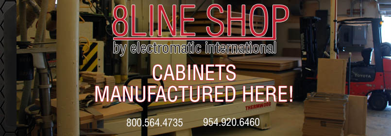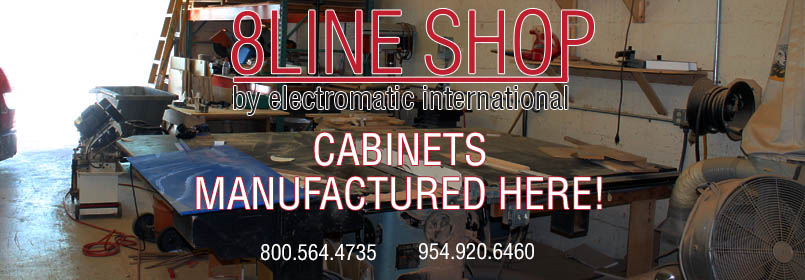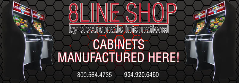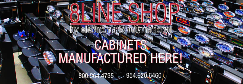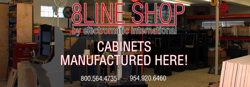8Line Shop & Electromatic International manufacture various 8 liner cabinets for, cherry masters, pot-o-gold, sweepstakes, sitdown, upright, counter-top and more. We build them from scratch to the finished product with all the "bells & whistles". We can customize them, the way you need. Because we build them we can offer the best prices around, no middle man on these cabinets.